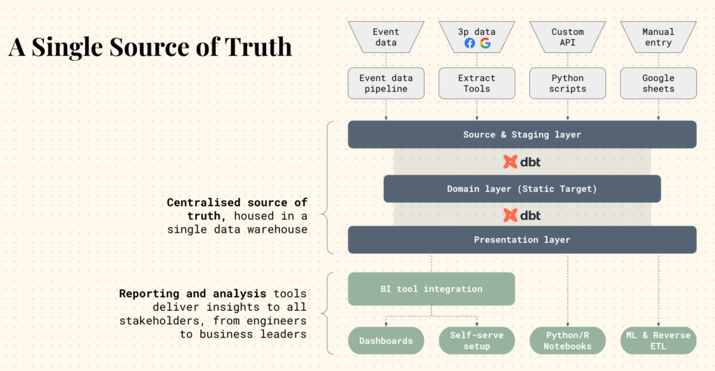 Modern tools make SSOTs much easier to build than before. A typical architecture uses a cloud data warehouse (Snowflake, Databricks or similar) to ingest all raw sources, and a data transformation layer (dbt, Airflow) to clean and model the data.